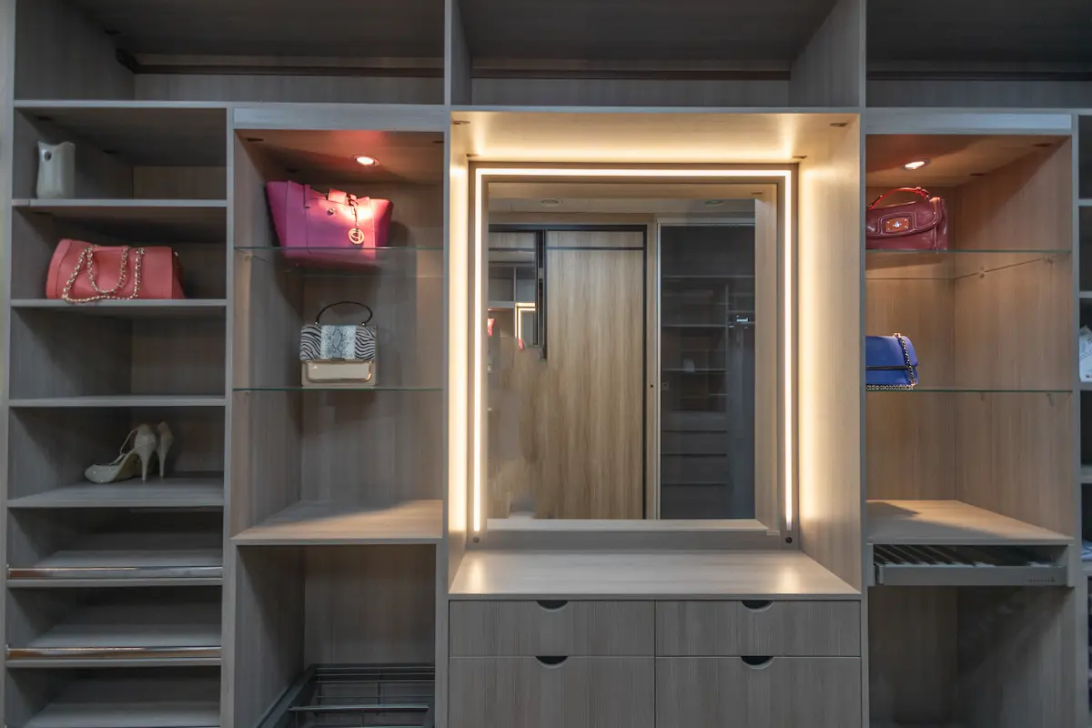 • شكل الإضاءة: تساعد الإضاءة في الغرفة في إظهار أناقة تصميم الدولاب، ويمكن إضافة إضاءة داخلية بالخزانة لتوفير مظهر جميل، وتؤثر تكلفة الإضاءة في تكلفة التصميم الكلي للدولاب.