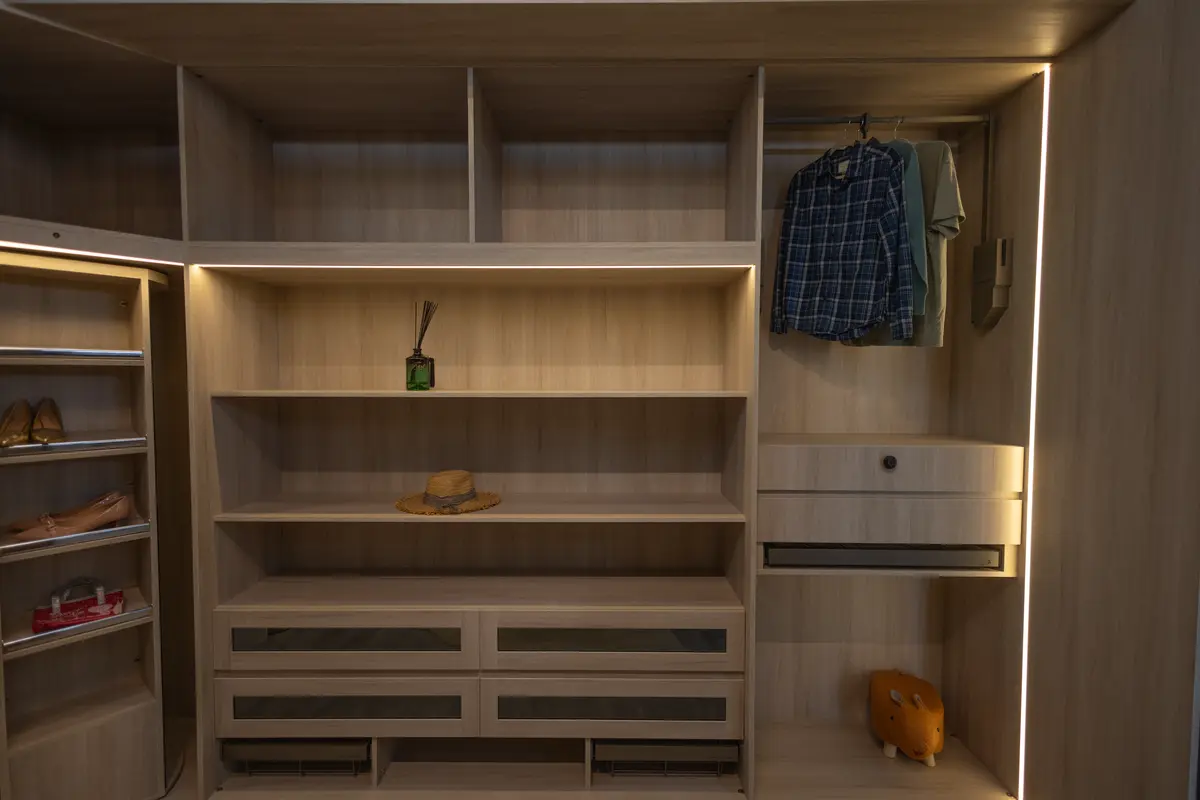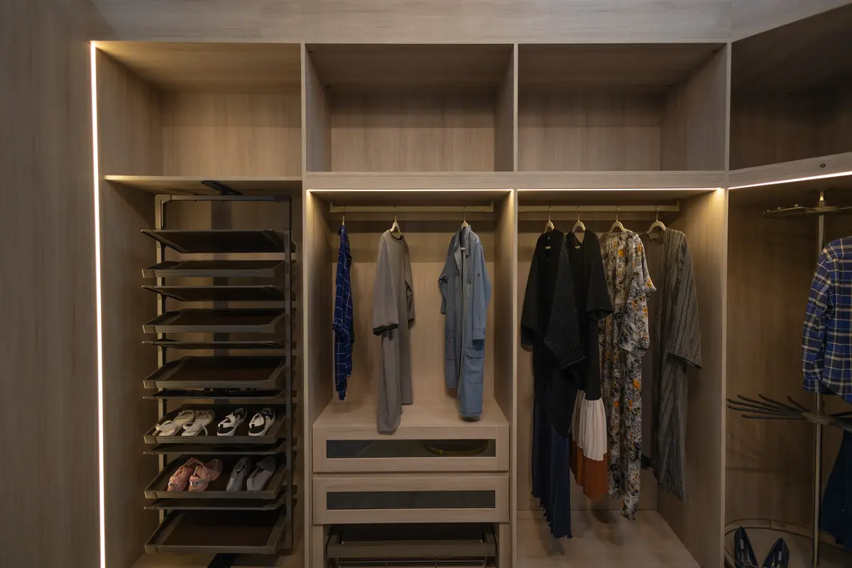 • يتم به تخصيص غرفة كاملة لترتيب الملابس، وتخصيص مجموعة  كبيرة من الرفوف، لتخزين الملابس والأحذية والحقائب.