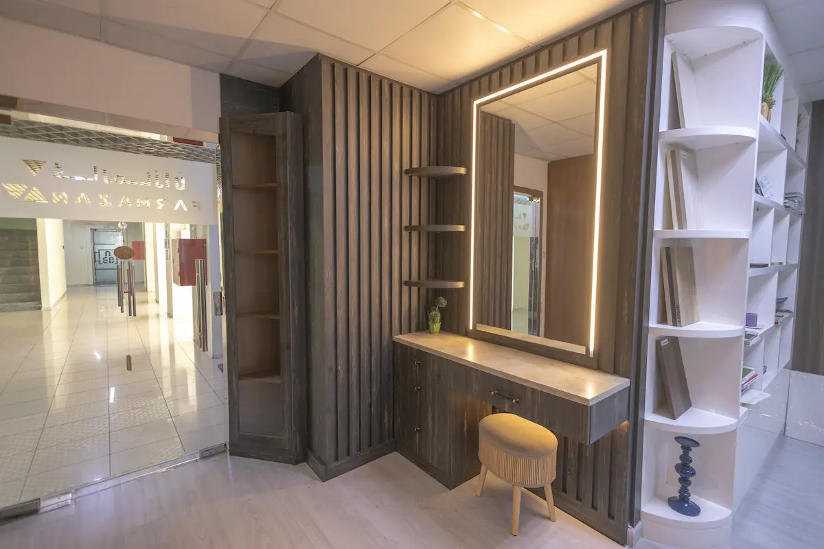 - خزانة مدمجة مع التسريحة: يمكن تصميم خزانة الملابس بالخشب بشكل مدمج مع التسريحة لتخزين الملابس بها، مع استغلالها في رؤية مظهرك خلال اللبس.