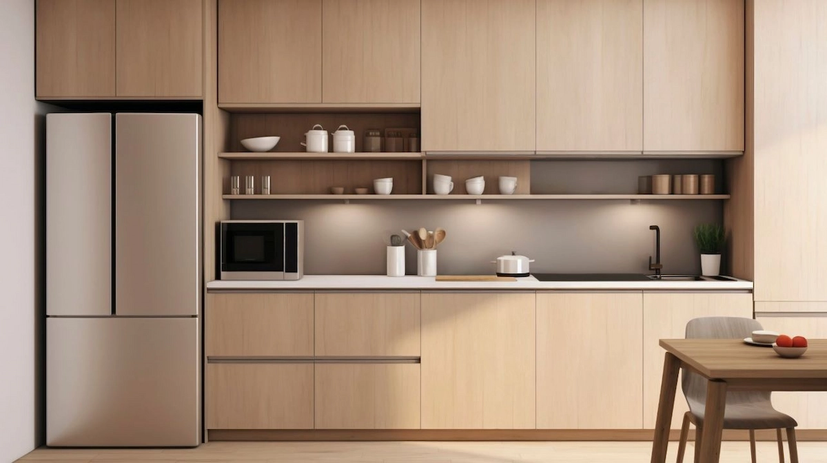 تصميم المطبخ المفتوح يكون عبارة عن مجموعة من الأرفف والأدراج، يعرض من خلالها أغراض المطبخ، ويمتاز هذا التصميم بطابعه الحميمي والأنيق، وهو من أحدث تصاميم المطابخ الخشبية الجميلة، حيث يقدم لك مطبخًا دافئًا بألوان هادئة وتخزين مبتكر، يجمع بين الراحة والأناقة بشكل مثالي.