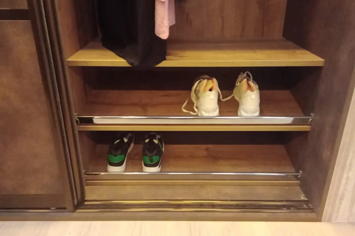 - Wardrobe with an Integrated Lower Shoe Rack: A conventional wardrobe featuring a dedicated shoe rack wooden section at the bottom, with space between it and the floor for ventilation.